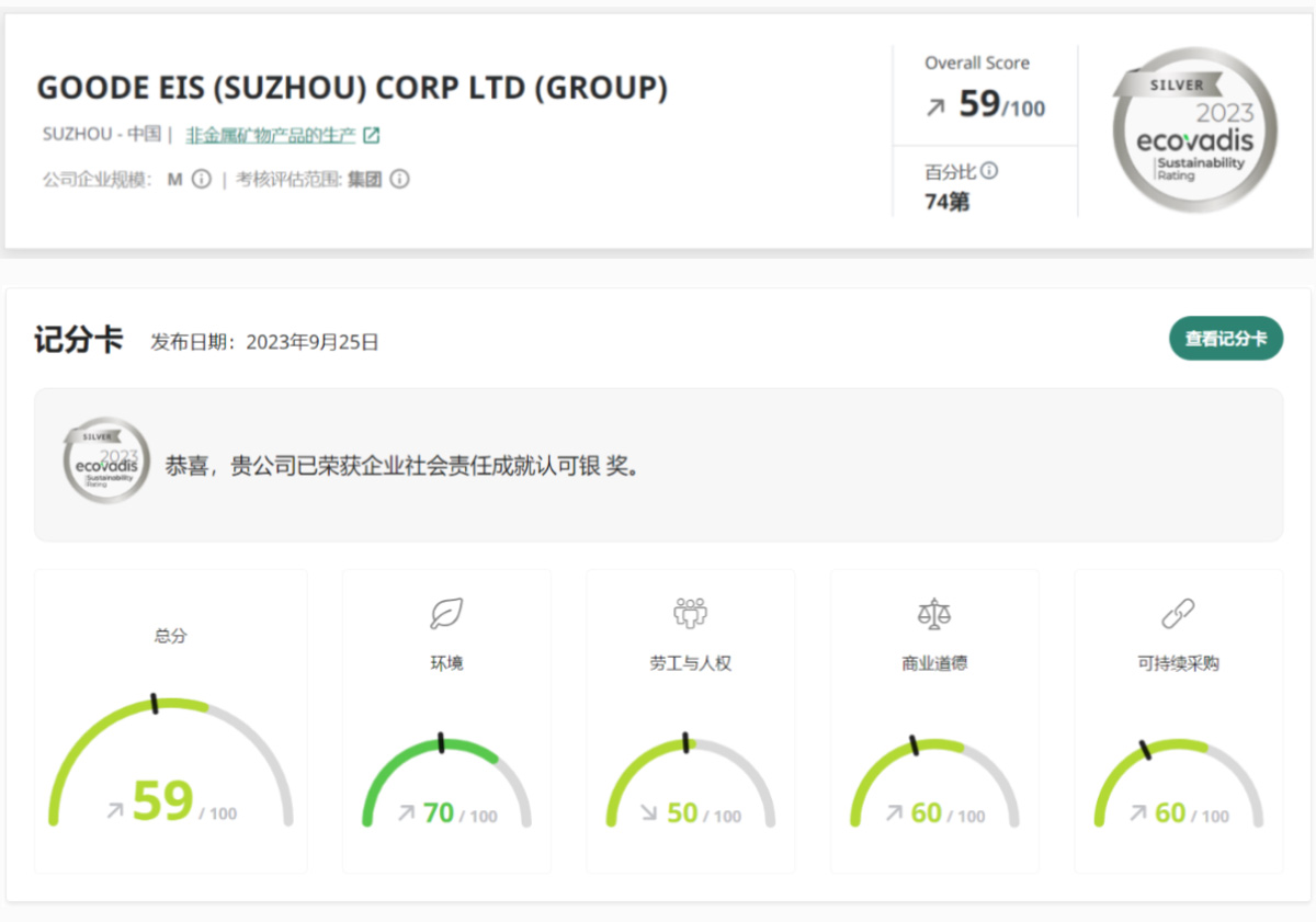 Nedávno Goode EIS (Suzhou) Corp LTD. (Goode Electrical Materials) v roku 2023 dosiahla 59 bodov v certifikácii udržateľnosti Ecovadis a získala striebornú medailu, čím sa umiestnila 26 % z 85 000 podnikov zúčastňujúcich sa na globálnom hodnotení a 8 % najlepších v Číne.